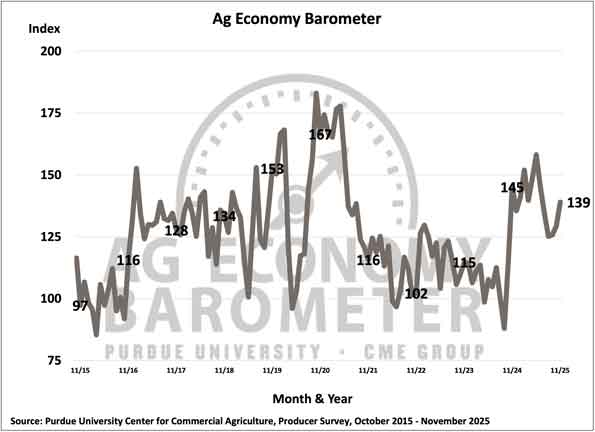 Farmer sentiment strengthened in November as rising crop prices and improved export prospects pushed the Purdue University/CME Group Ag Economy Barometer to 139—its highest reading since June. Much of the increase was driven by a sharp 15-point jump in future expectations, even as current conditions held steady. Financial outlooks improved alongside a 10–15% rally in fall delivery corn and soybean bids, helping offset weaker cattle prices in the livestock sector. Yet producers remain cautious: capital investment sentiment slipped further, and fewer farmers view today as a good time to expand. Long-term farmland value expectations reached a record high, while most corn producers anticipate stable cash rents heading into 2026. The survey also highlights shifting crop production strategies as growers respond to projected tight operating margins—considering lower-cost seed traits, reduced phosphorus applications, and adjustments to seeding and nitrogen rates.