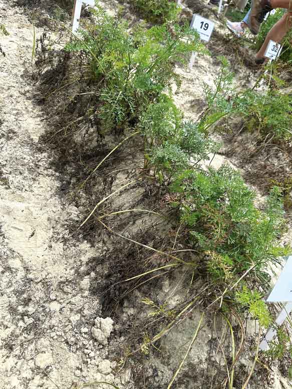 The Alternaria disease trial included 91 entries provided by private and public breeding programs and the USDA germplasm repository. Pressure for Alternaria leaf blight, caused by Alternaria dauci, is very high in North Carolina. Typical symptoms are dark brown lesions on the individual leaflets and petioles, and these lesions can be surrounded by a yellow halo. Severe infections can reduce root size and yield. The goal of the Alternaria trial was to gather preliminary information about carrot lines showing some level of resistance or tolerance to the disease. Alternaria prevention strategies were applied to the conventional trial, while the Alternaria trial was untreated, allowing natural occurrence of disease infection. Carrot lines showing a medium to high level of resistance to Alternaria leaf blight were noted.