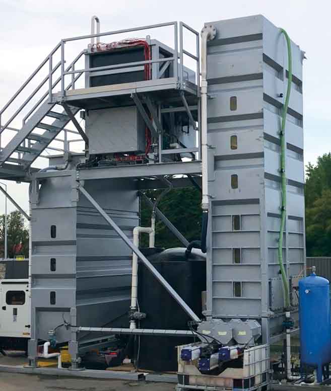 In stage one, dirty water is pumped from a tank to a micron filter, where filtered solids such as organic fibers, sand and produce are extracted. Pumps send the filtered water back to the process line for recycling, or to the next stage of water treatment, the mud tower. In stage two, fine soils such as silt settle in the mud tower as the water flows across its length. Clarified water then exits the tower via the overflow. Settleable solids are extracted from the base of the tower automatically. These extracted solids can be conveyed or deposited directly into waste bins. The final stage of processing takes place in the ElectroClear system. Here, water is treated to a high level of clarity with no need for added chemicals.