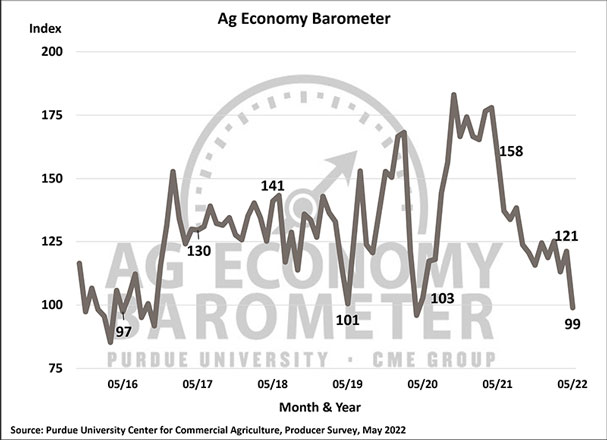 The Purdue University/CME Group Ag Economy Barometer dropped to its lowest level since April 2020, down 22 points in May to a reading of 99. Agricultural producers’ perceptions regarding current conditions on their farms, as well as their future expectations, both weakened this month. The Index of Current Conditions dipped 26 points to a reading of 94, and the Index of Future Expectations fell 21 points to a reading of 101. The Ag Economy Barometer is calculated each month from 400 U.S. agricultural producers’ responses to a telephone survey. This month’s survey was conducted May 16-20.