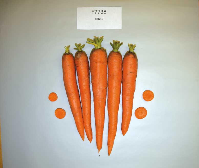 Line F7738 is a new carrot breeding line available for developing cello hybrids. It has performed well in trials for cavity spot resistance and was selected for its mild, sweet flavor.