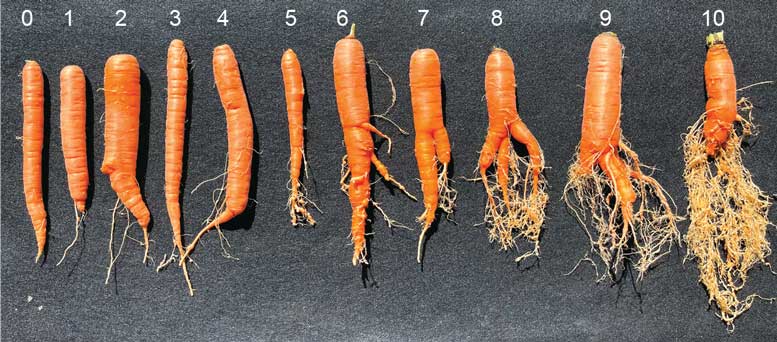 Carrot roots were evaluated for galling at mid-season and at harvest. About 100 carrots from each plot were randomly sampled and were visually rated for the severity of root galling on a scale of 0-10 (0=no galls, 10=completely galled roots), as shown in Fig. 2. The average galling on these roots was used to give a galling index for each plot. Data on root galling was analyzed using statistical analysis software.