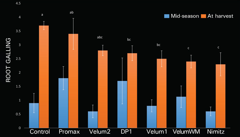 The severity of root galling was assessed at mid-season (Sept. 2, 2021) and harvest (Oct. 20, 2021). At mid-season evaluations, the damage was quite mild, and root galling ranged between 0.5 in the Nimitz treatment and 1.75 in the organic treatment Promax and the developmental product DP1(Fig. 3). At harvest, there was a moderate increment in root galling across all treatments, and the treatments Nimitz, Velum+Watermaxx, Velum at planting and DP1 had significantly lower root galling compared to the untreated control. The treatments Promax and Velum post-plant were also numerically lower than the untreated control.