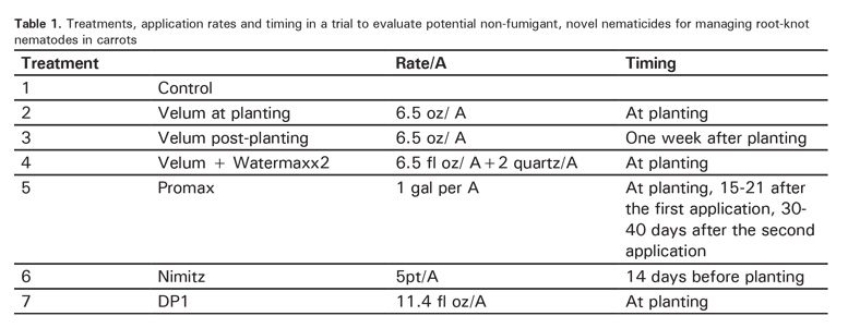 Therefore, alternative control options that have high efficacy, are economically viable and are environmentally safe need to be evaluated under field situations. So far, there are no non-fumigant nematicides registered in California for use on carrots.