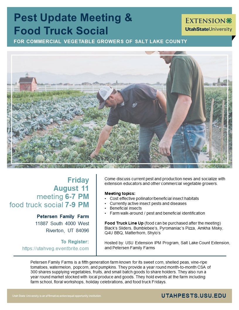 The USU Extension IPM Program and Salt Lake County Extension are hosting an on-farm commercial vegetable grower meeting and food truck social at Petersen Family Farm in Riverton, Utah on Friday, August 11 at 6 pm. All vegetable growers that sell their produce are invited to attend.