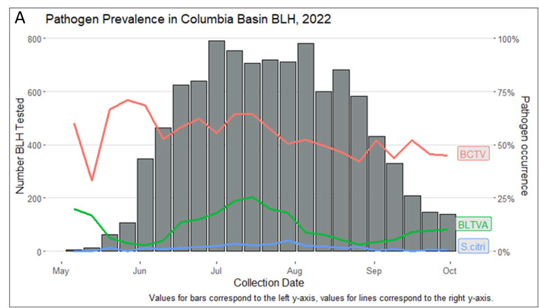 During the 2022 season, BCTV, BLTVA and S. citri pathogen prevalence in beet leafhoppers was incorporated into the WSU Potato Decision Aid System (www.potatoes.decisionaid.systems). Here, heat maps depict weekly rates of pathogen prevalence broken down by region, and visitors can toggle between the weekly data to observe pathogen changes over time. The goal is to have this information updated weekly throughout each growing season to help growers make more informed IPM decisions regarding timing and number of applications for control of the beet leafhopper. This information, in addition to knowledge gained from field or greenhouse trials that explore pathogen dynamics across different crops and beet leafhopper movement in the landscape, should enable growers to improve management of the economically important beet leafhopper-associated pathogens.