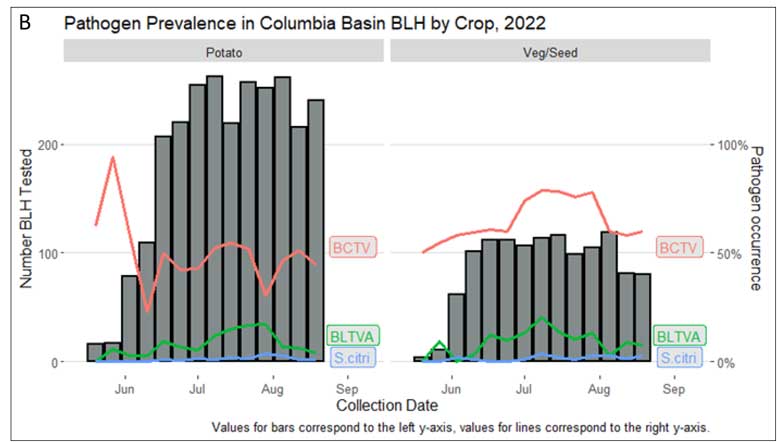 In the Columbia River Basin region of Washington and Oregon, the phloem-feeding beet leafhopper vectors three pathogens to vegetable and seed crops. Beet curly top virus (BCTV) causes yellowing or slight reddening of leaves, leaf curling or cupping, and plant stunting in crops such as sugar beet, bean, coriander, tomato, pepper and cucurbits. Beet leafhopper-transmitted virescence agent (BLTVA) phytoplasma generally causes purpling of upper leaves and leaf curling in affected crops such as potato, tomato, pepper and carrot. BLTVA also induces aerial tuber formation and early plant senescence in potato and causes the over-proliferation of lateral roots in carrot. Spiroplasma citri can occur in carrot and causes infections characterized by leaf purpling or yellowing, stunting of shoots and taproots, and the over-proliferation of lateral roots. Fields infected with any of these three pathogens can see a reduction in yield and crop quality depending on the severity of infection.