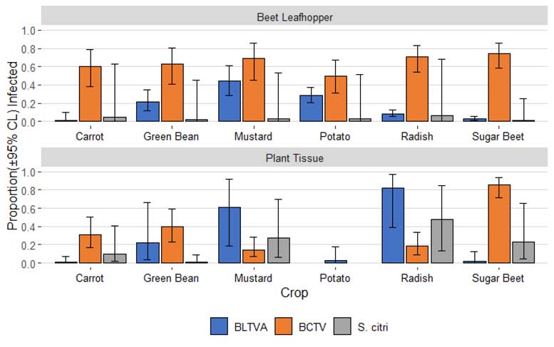 A replicated plot study with six crops (potato, green bean, sugar beet, radish, carrot, mustard) was conducted at the USDA-ARS farm in Moxee, Washington. Beet leafhoppers and plant tissue were collected from each plot on a bi-weekly basis. In beet leafhoppers, BCTV levels were the highest and S. citri levels the lowest among the three pathogens regardless of the crop where specimens were captured (Fig. 1a). BLTVA prevalence varied in beet leafhoppers collected from the different crops. Contrary to this, the levels of all three pathogens varied in plant tissue from the six different crops used in the study (Fig. 1b). These results indicate that pathogen transmission by the beet leafhopper to different plant species may not be equal. This trial will be replicated in 2023 to confirm these findings.
