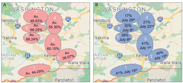 Irrigated agriculture in the Columbia River Basin of Washington encompasses a wide geographic range. The 2022 beet leafhopper collection locations were divided into seven geographically defined regions to assess differences in pathogen prevalence based on geography. Regions were identified as the following: Paterson, Snake River, Basin City, Othello, Mattawa, Royal City and Quincy. Average BCTV pathogen prevalence was lower in the southern Columbia Basin regions of Paterson and Snake River, while average levels were higher in the central regions of Mattawa, Royal City and Basin City (Fig. 3a). Average levels in northern Columbia Basin regions of Othello and Quincy were moderate, despite being the only two regions where traps were deployed in vegetable and seed crops. This suggests that location in the Columbia Basin could have a greater impact on BCTV pathogen prevalence than crop type alone. While BLTVA pathogen prevalence peaked at different weeks in July among the regions, the highest peak rates were at 40-41 percent in early to mid-July in the southern regions, and the lowest peak rates were at 17 and 21 percent later in July in the northern regions (Fig. 3b). Overall, these results suggest that BLTVA could be a higher threat in the lower Columbia Basin and BCTV a higher threat in the central region. Data from additional years is needed to confirm these results and determine if this is a consistent trend or simply a unique finding in the 2022 season.