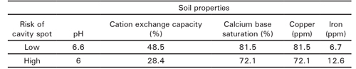 The study identified several differences in soil properties and microbial communities between low-risk and high-risk fields for cavity spot. Low-risk soils had higher calcium base saturation (CaBS) at 81.5%, higher cation exchange capacity (CEC) at 48.5 meq/100g and a pH of 6.6. In contrast, high-risk soils had higher levels of copper (Cu) at 12.6 ppm and iron (Fe) at 209.6 ppm and lower pH (~6) (Table 1).
