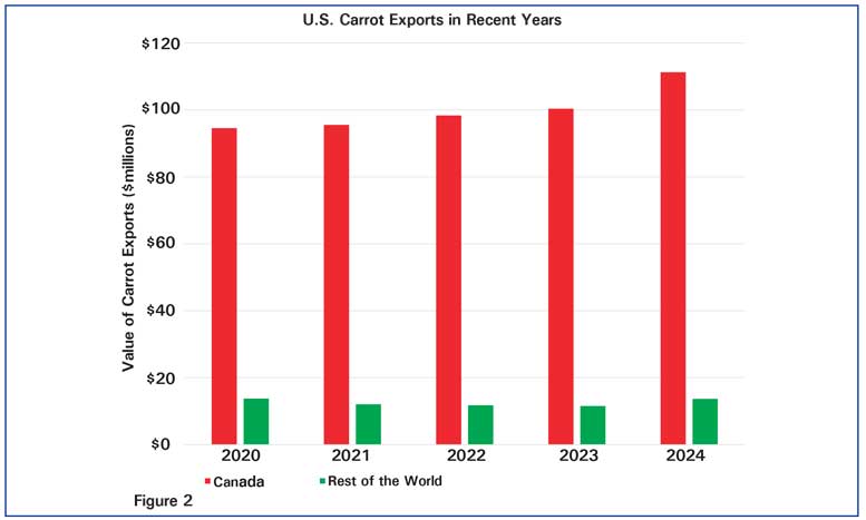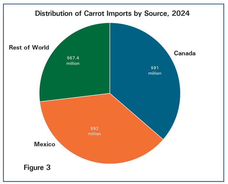 Fig. 3 shows that the value of U.S. imports in 2024 totaled about $250 million. These imports were divided three ways: about 36.5% each from Mexico and Canada and about 27% from the rest of the world. Almost all the fresh carrots are from Canada and Mexico, and more than one third of the processed carrot imports are from other sources including China for about half the dried carrots, which comprises only about 5% of total carrot imports.