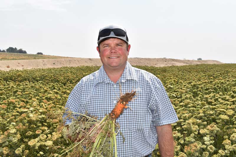 Eric Jemmett inspects a carrot seed field in Parma, Idaho. Two miles of isolation between plots spreads his seed fields across the towns of Huston, Wilder, Parma and Notus, Idaho.