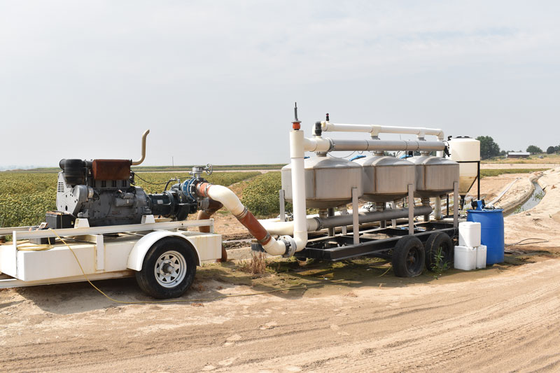 Movable pumps and filters custom-designed by J&S Farms and built by Clearwater Irrigation take water out of canals.